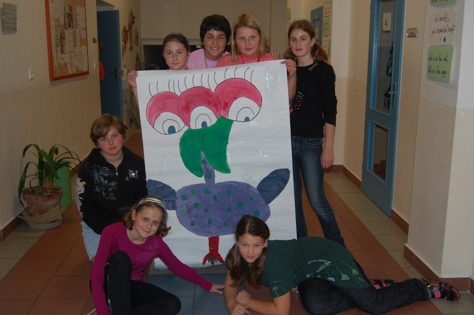 Pak jsme začali komunikovat s partnerskou školou přes videokonferenci, zjistili jsme, že slovenština opravdu není žádný problém. O našich partnerech tedy víme odedneška mnoho věcí. Část záznamu je třeba zde: http://www.youtube.com/watch?v=cGWQgLJAvF4. No a čekalo nás překvapení, totiž žlutomodrá a modrožlutá piškotová roláda, mňam! Následně jsme si zahráli v tělocvičně žlutí proti modrým zápas v dodgeballu a vybíjené, která byla skoro zabíjená. Z tělocvičny nás vyhnali čutálisti, tak jsme šli řádit do třídy, ale řádit jen trošku, spíš si zahrát zajímavé komunikativní hry s vedoucím školního klubu Vlastíkem Šmídem. Fakt bylo docela těžké zklidnit naše pohybem rozdováděná těla, ale podařilo se. Spousta soutěží byla totiž zaměřená na spolupráci nás všech a na jemnou motoriku. Nakonec vkládáme pro naše následovníky popis námi vytvořeného pazvířete z eTwinningového pralesa:Ivana Brabcová: A tady je Malšovníček dle Doudlebáků :-)